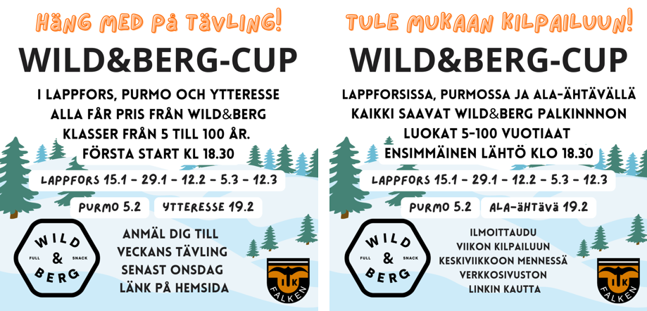 WILD&BERG-Cupen hålls på torsdagar och är tävlingar där alla får ett pris från Wild&Berg samt saft i skidstugan efter målgång.